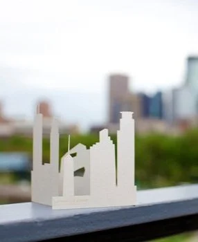 The majority of the wedding guests were coming to Minnesota from the coasts, so the invitations were designed to be the first glimpse of Minneapolis and the wedding. As a stand-alone element, the city-wrap could remain at each guest's home and would be a reminder of their weekend in Minneapolis. The other print materials pulled the silhouette of the Walker Art Center from the invitation and became a 'logo' of sorts, which was carried throughout the printed materials from the welcoming package for their hotel guests (schedule of wedding events, food and beverage recommendations and welcome note), to the program, and the menu.