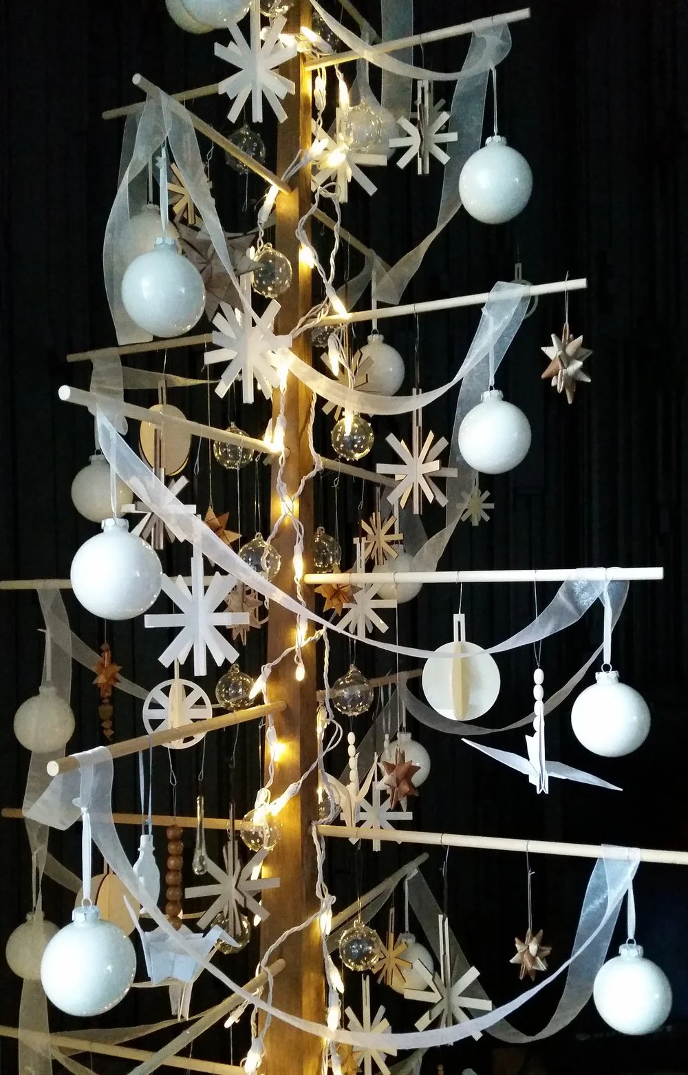 Tia originally conceived of this alternative Christmas tree in 2003 as a one of a kind tree for our own home. The Modern Tannenbaum's tapered wood trunk was the heart of the design and the first prototype sat atop a salvaged metal base that had been used for a retail fixture. Souliyahn designed the chunky, interlocking wood X-base and Robert Feyereisen perfected the spun connection of the trunk to the base.
