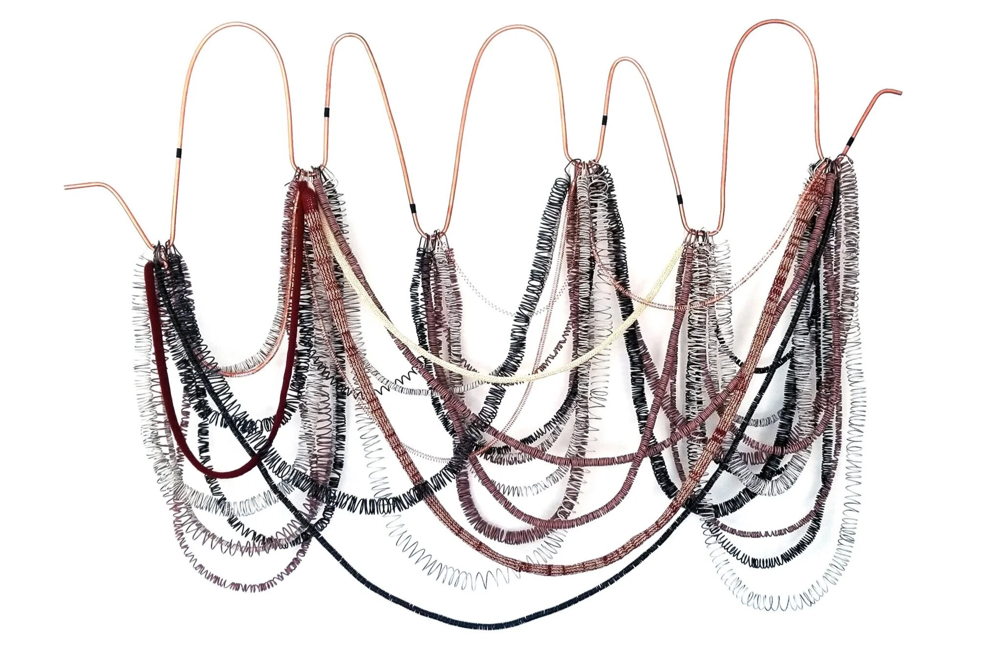 Undulating copper conduit symbolizes the bloodline, a channel of lineage. Hanging coils of electrical wire formally suggest spiraling DNA or umbilical cords and conceptually symbolize the lived experience and energetic-transference that leaves and returns back to the main conduit. The literal weight of inherited trauma on the entire bloodline is evident as it builds with each generation, unacknowledged.